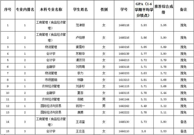 根据《bet36365路检测中心2018年推荐优秀应届本科毕业生免试攻读硕士学位研究生工作实施办法》的意见和《bet36365路检测中心关于2018年优秀本科毕业生免试攻读硕士研究生的推荐办法》规定,对2014级33位申请人进行综合排名后,最终确定以下13人具备免试攻读硕士研究生资格和2名备选人员,名单如下: