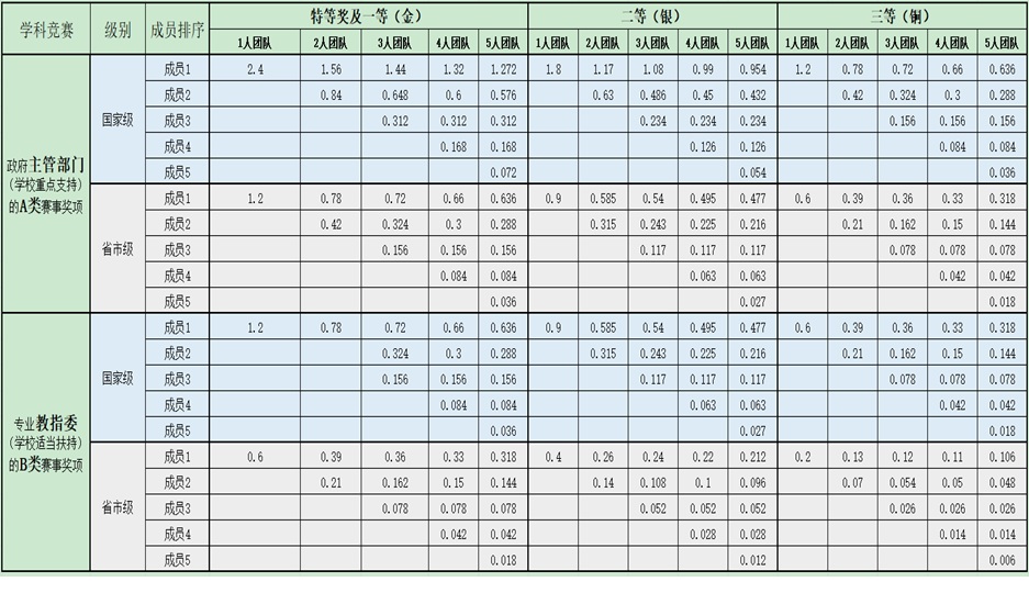 政府主管部门(学校重点支持)的奖项 | 国家级 | 2.4 | 1.8 | 1.2 |